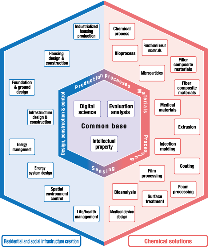 SEKISUI CHEMICAL operates four primary research and development centers within the Housing Company, the Urban Infrastructure and Environmental Products Company, the High Performance Plastics Company, and our corporate headquarters. In addition, SEKISUI MEDICAL CO., LTD., and other key affiliated companies maintain their own research facilities and R&D divisions.