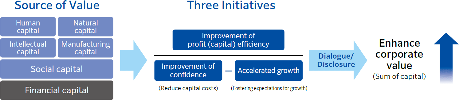 We are promoting three initiatives to improve corporate value: improvement of capital efficiency, improvement of confidence, and accelerated growth. I believe that the most important thing for improvement of capital efficiency is to grow existing businesses. In order to foster expectations for growth, the “creation of new business areas” specified in the strategic area map is key, and we must set milestones for the commercialization of high-focus Innovation Areas in recent years, such as perovskite solar cells. With regard to reducing capital costs, I believe it is important to interpret this in a slightly broader sense, while also enhancing corporate governance. We will emphasize preventing the occurrence of incidents, such as serious misconduct that will damage corporate value if it occurs, while also evolving environmental management and human capital investment, and respecting human rights throughout the supply chain.