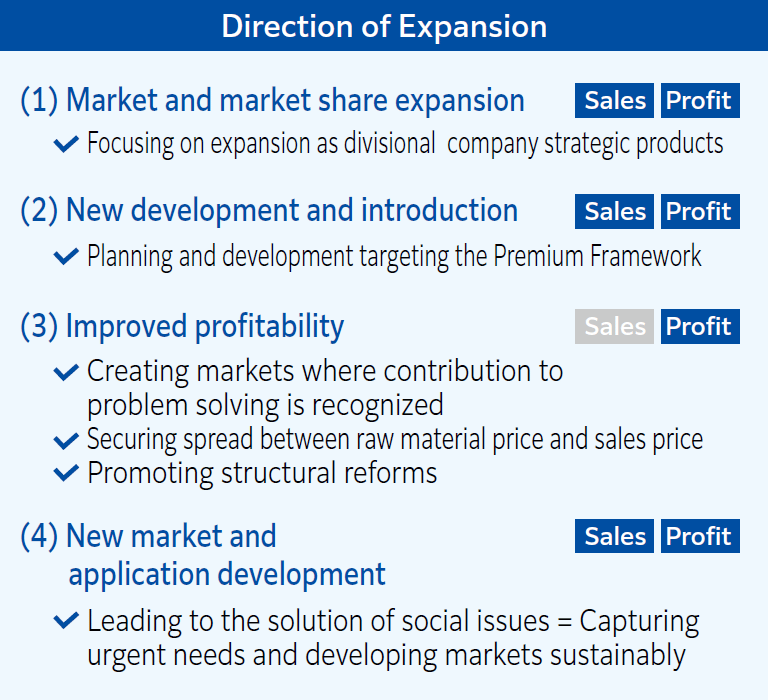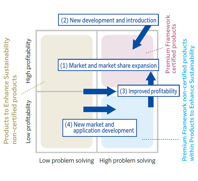 Additionally, Products to Enhance Sustainability are indispensable for the Group’s growth. Each business department is particularly focused on expanding its Premium Framework, and also emphasizes a product portfolio with social contribution and profitability as evaluation factors for each product. By creating new markets that contribute to solving social issues, we will increase the profitability of Products to Enhance Sustainability and push them into the Premium Framework.